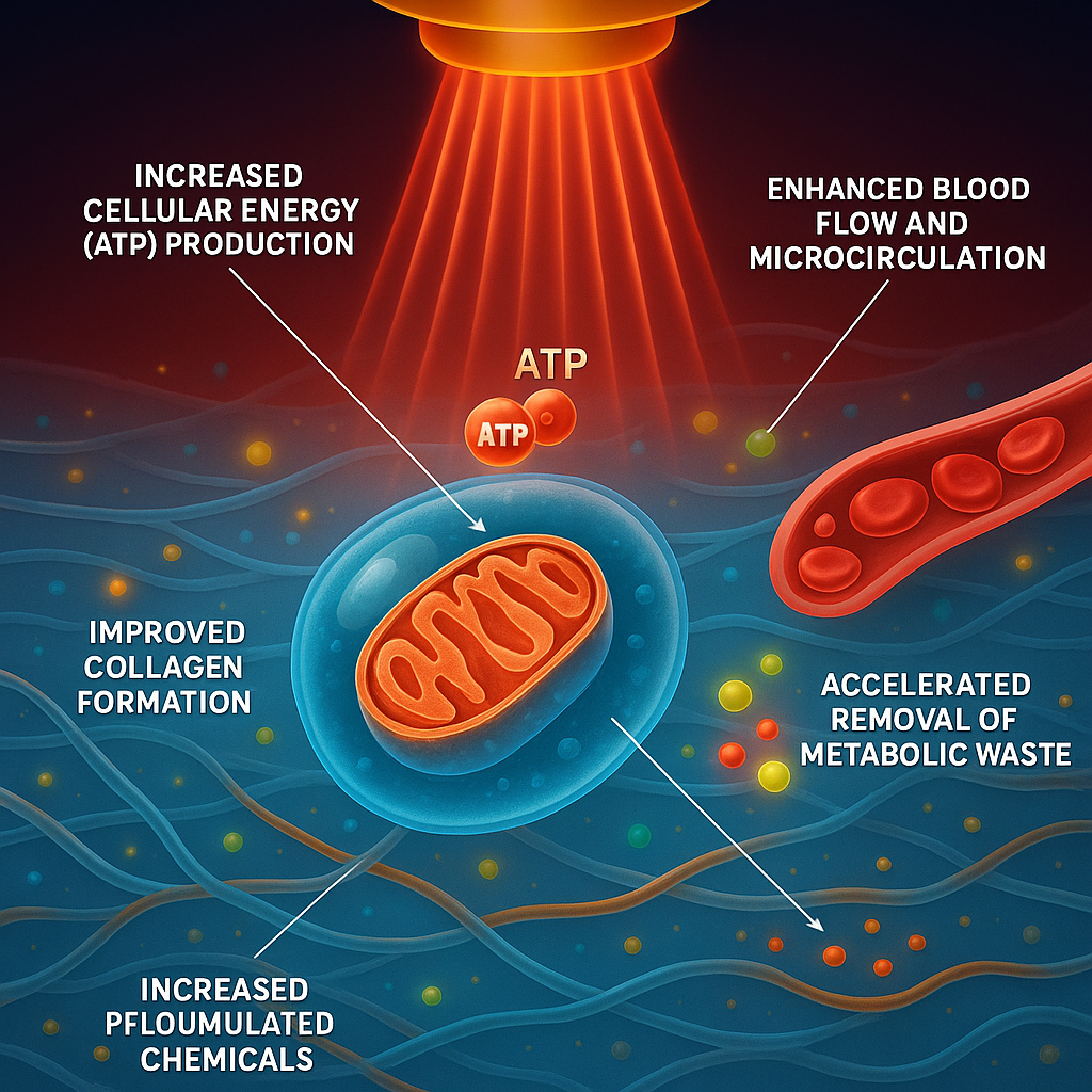High-power laser therapy uses concentrated wavelengths of light (typically 810–980 nm) that penetrate deep into tissues. This energy triggers biochemical changes known as photobiomodulation.